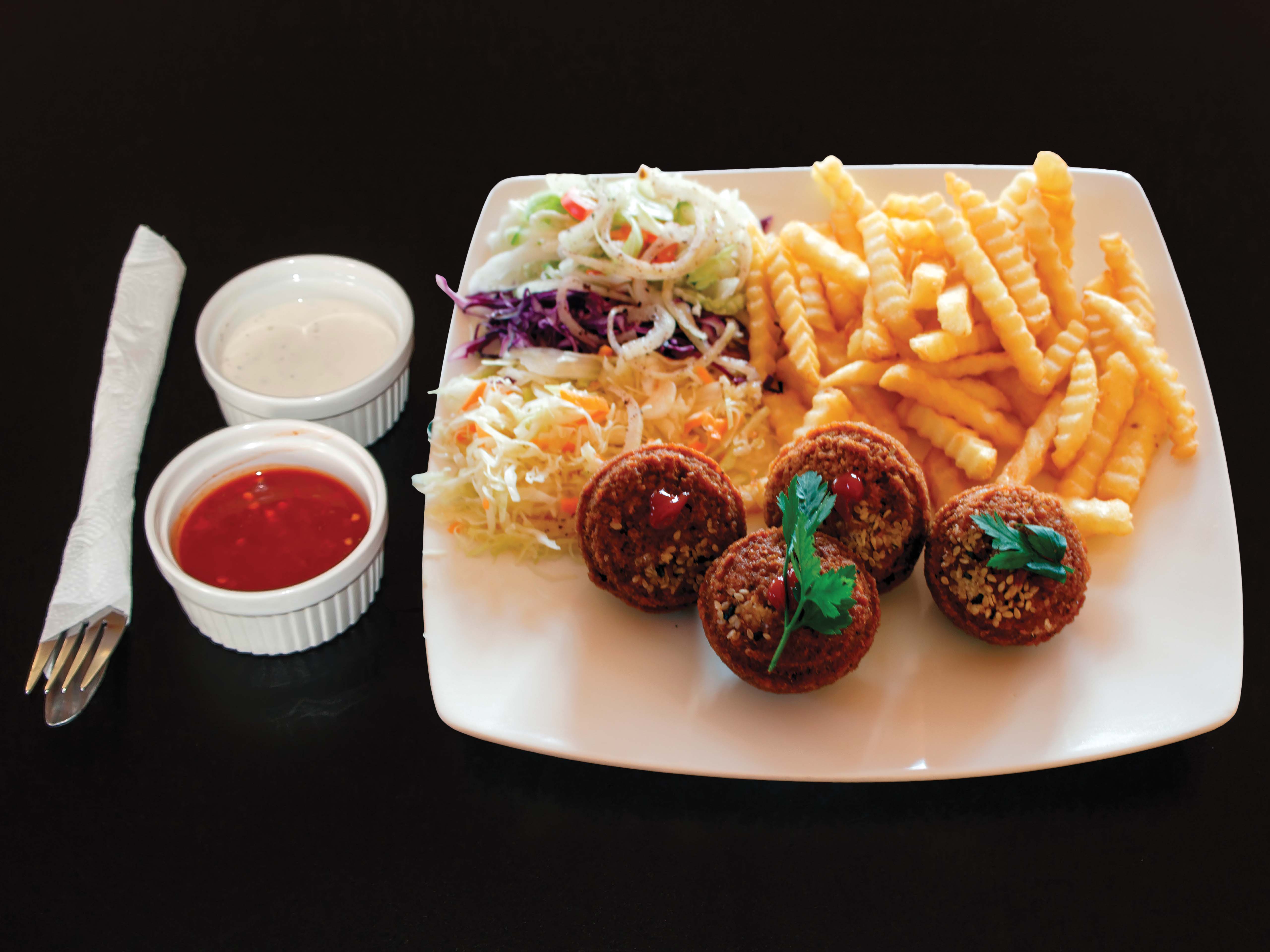 (frytki, sałata lodowa, pomidory, ogórki, papryka, oliwki)